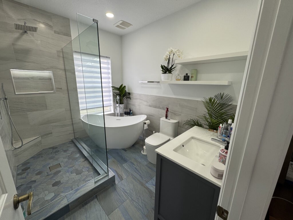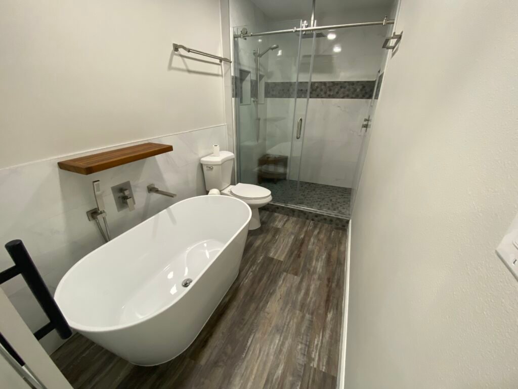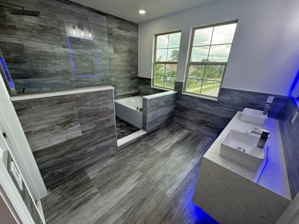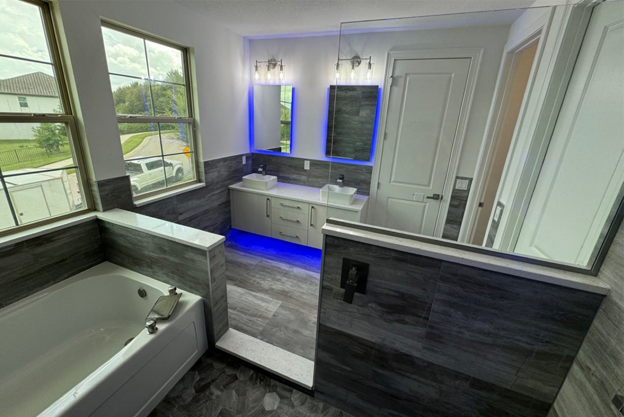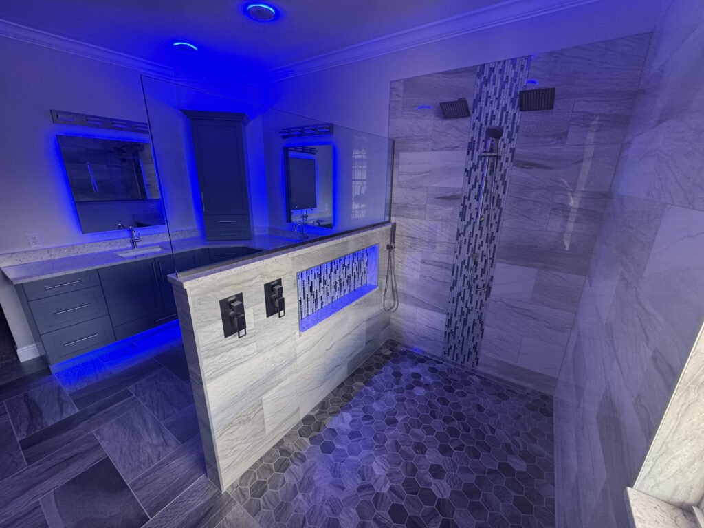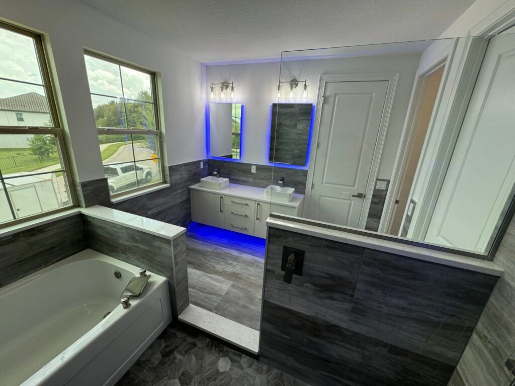 The unique part about this project was having a wet area spanning half of the bathroom containing both the bathtub and shower all within a tiled curb. We tiled around the entire room halfway up the wall, with a floating vanity and under cabinetlighting to make the space special.