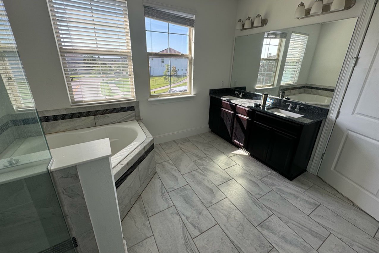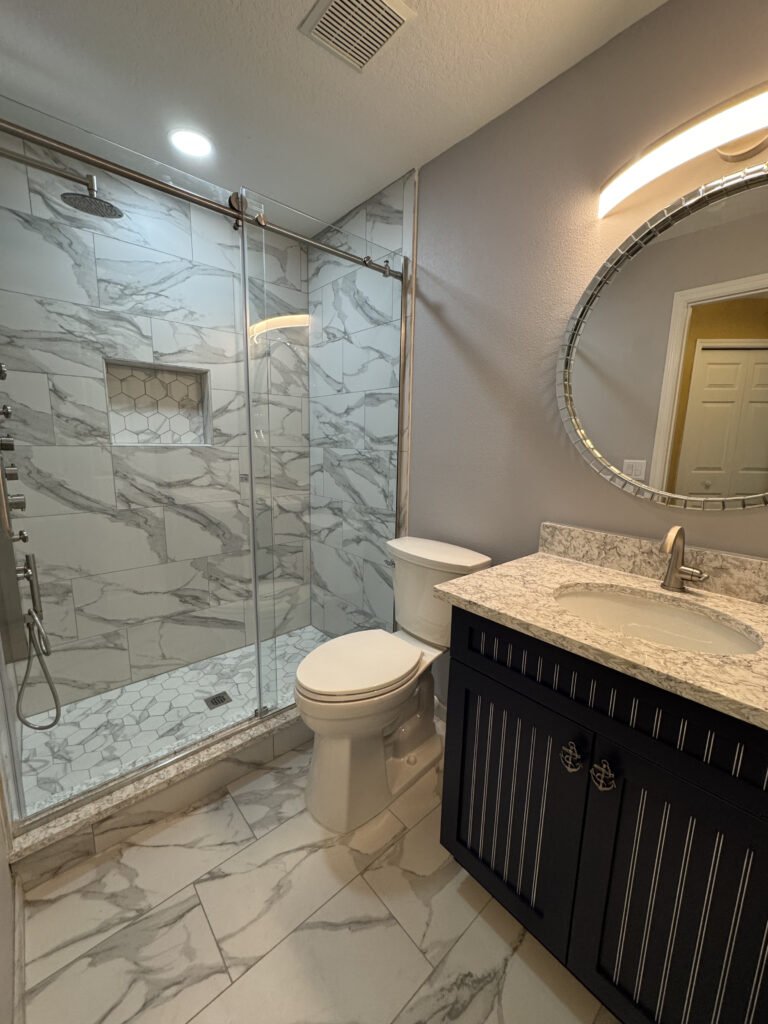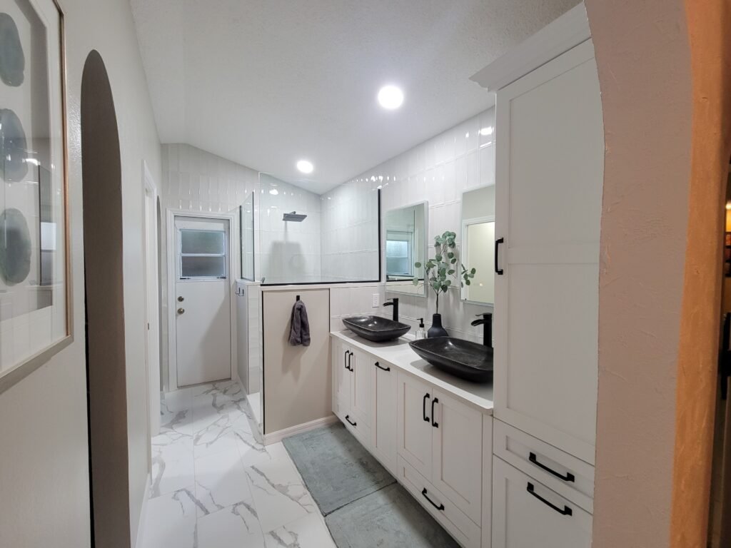 For this vacation home project, we were looking to upgrade the space for guests in their stay with clean colors and better space utilization. We took out the bulking soaking tub in favor of a better floor layout and a walk in shower. Finishing the room in sleek tile and neutral tones.