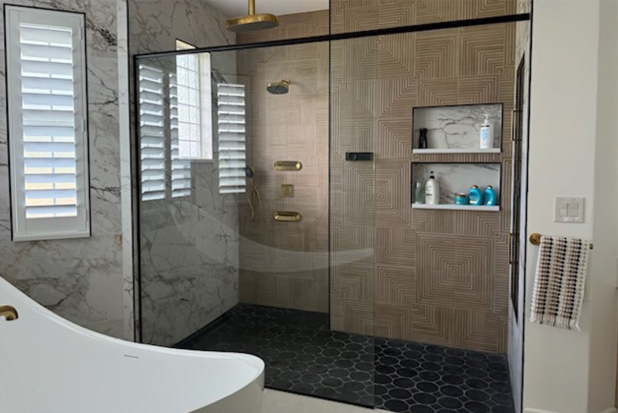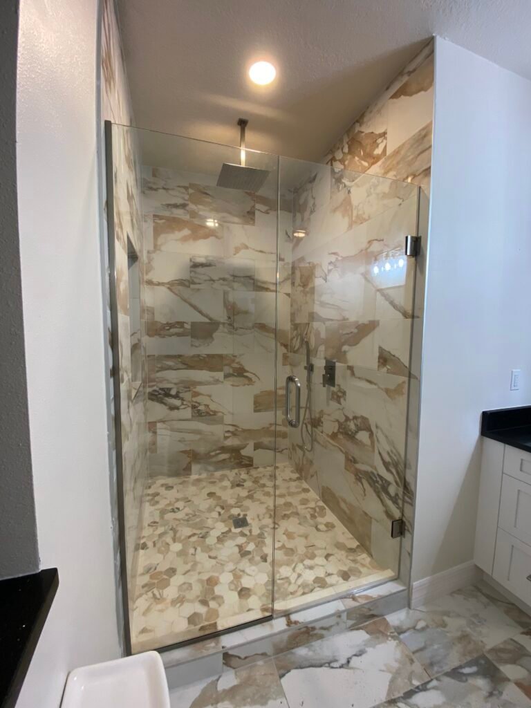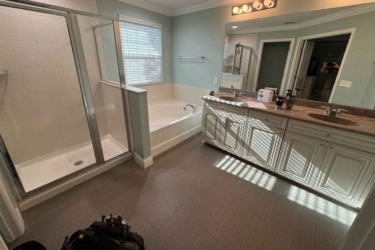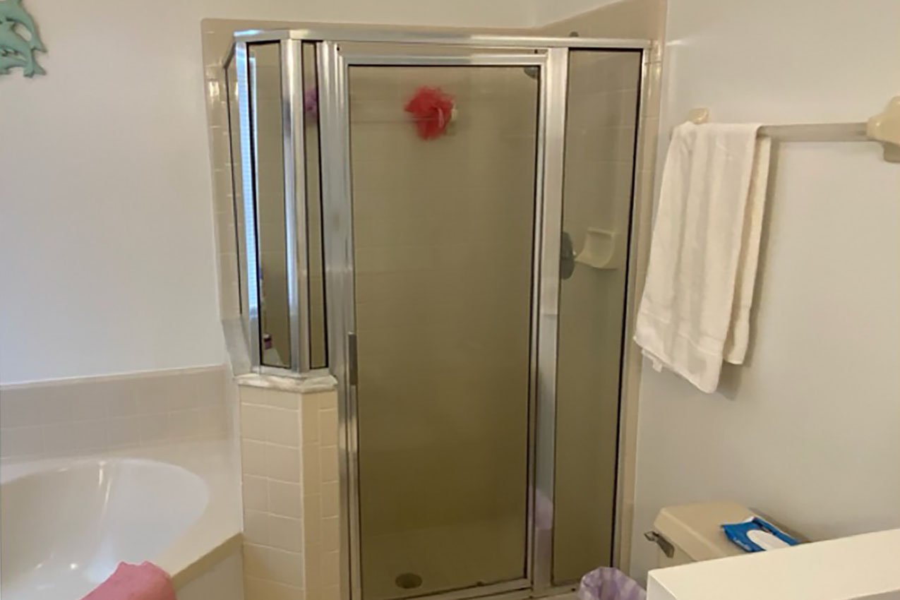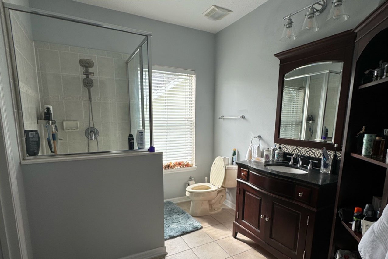 This client was struggling for space in their master bathroom. Between a claustrophobic shower encloser and a door that felt like it banged against the toilet, we reinvented the space