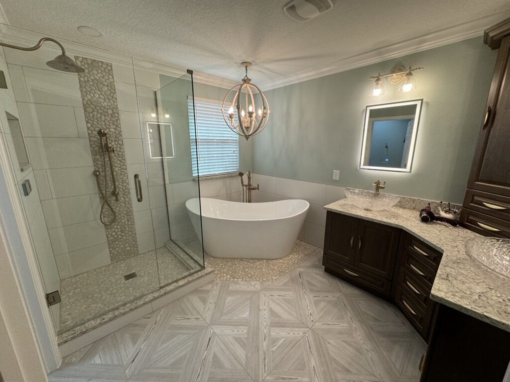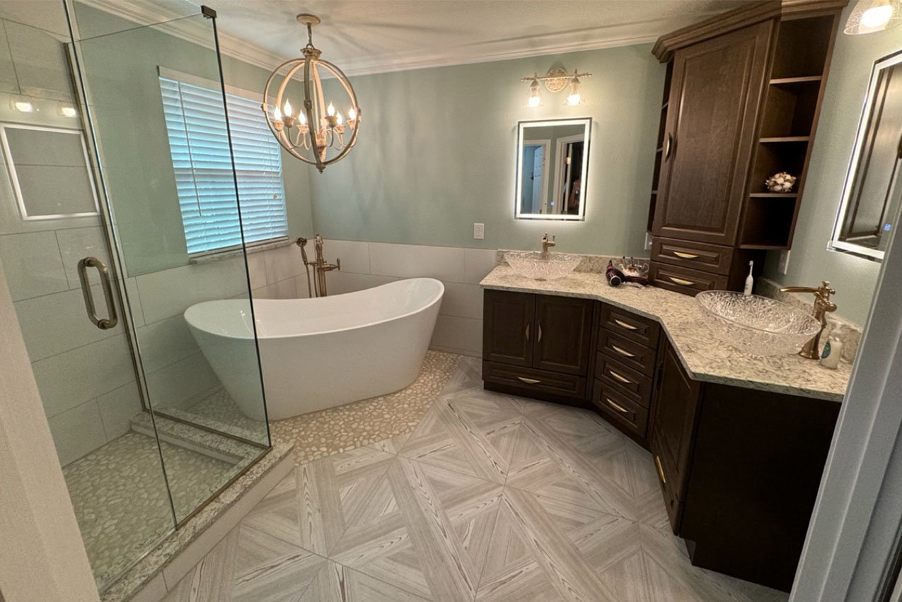 For this project, the client wanted to create color cohesion between all elements of the bathroom, while updating the space with more storage in the vanity. To achieve this, we separated the shower and tub, installing a free standing tub and frameless glass shower doors. We also fit a vanity to occupy the corner of both walls to almost double their storage space, with a center stack on top.