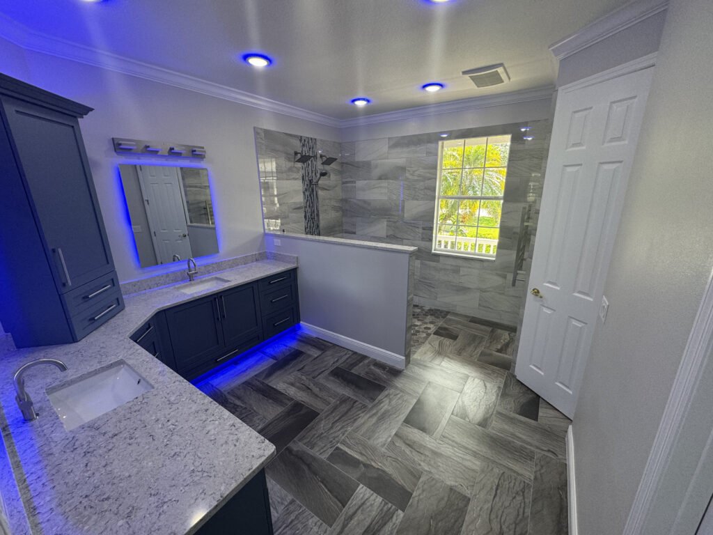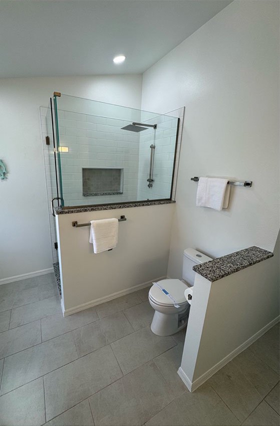 In this house, we did a multitude of work to create a wheel chair accessible space for ease of living. This included a wheelchair accessible shower opening and ADA handlebars in all the requires spaces. We also furnished both walls with cabinets to accommodate all the storage needs of the individual.